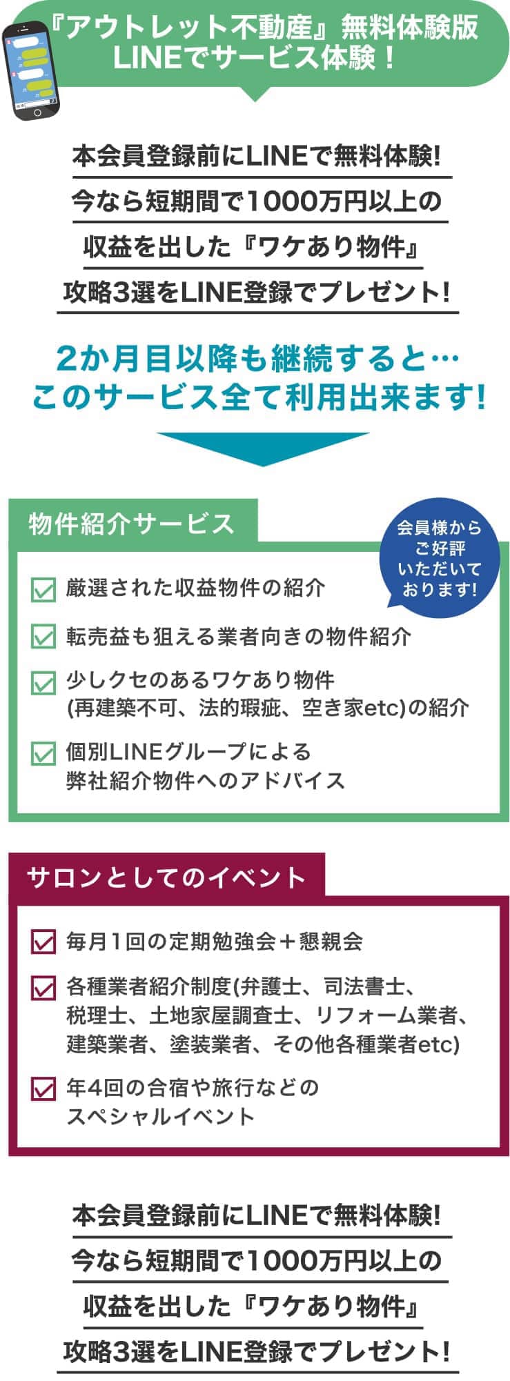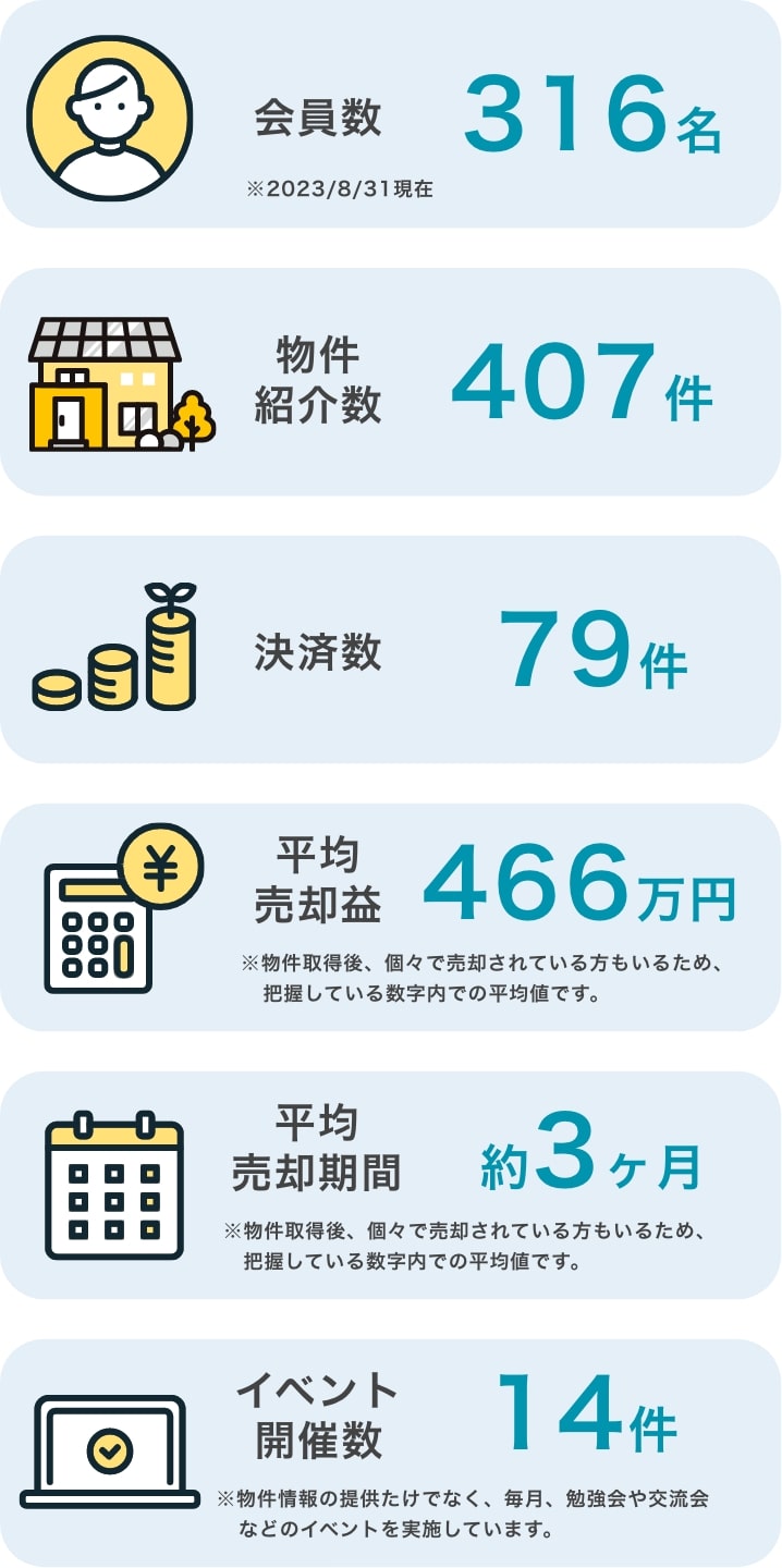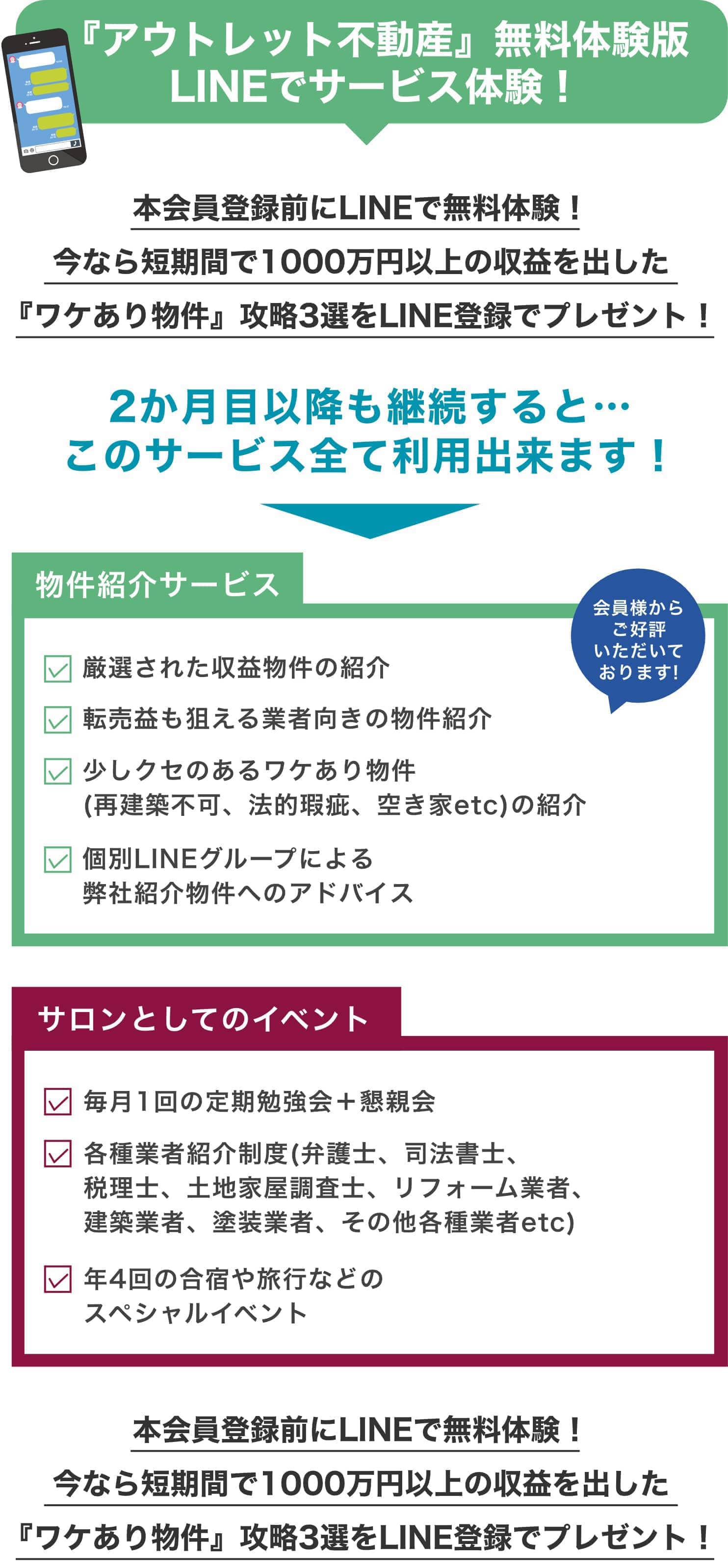 そんな“お宝物件(アウトレット)”を毎週ご紹介する、会員制の不動産投資サロンです。再建築不可や事故物件など、一般的には敬遠されがちな物件も、プロの目でしっかり厳選。物件の紹介だけでなく、購入後のサポートや売却までしっかりフォローします。専門家の紹介や会員同士の交流イベントもあり、初心者でも安心して参加できる環境です。